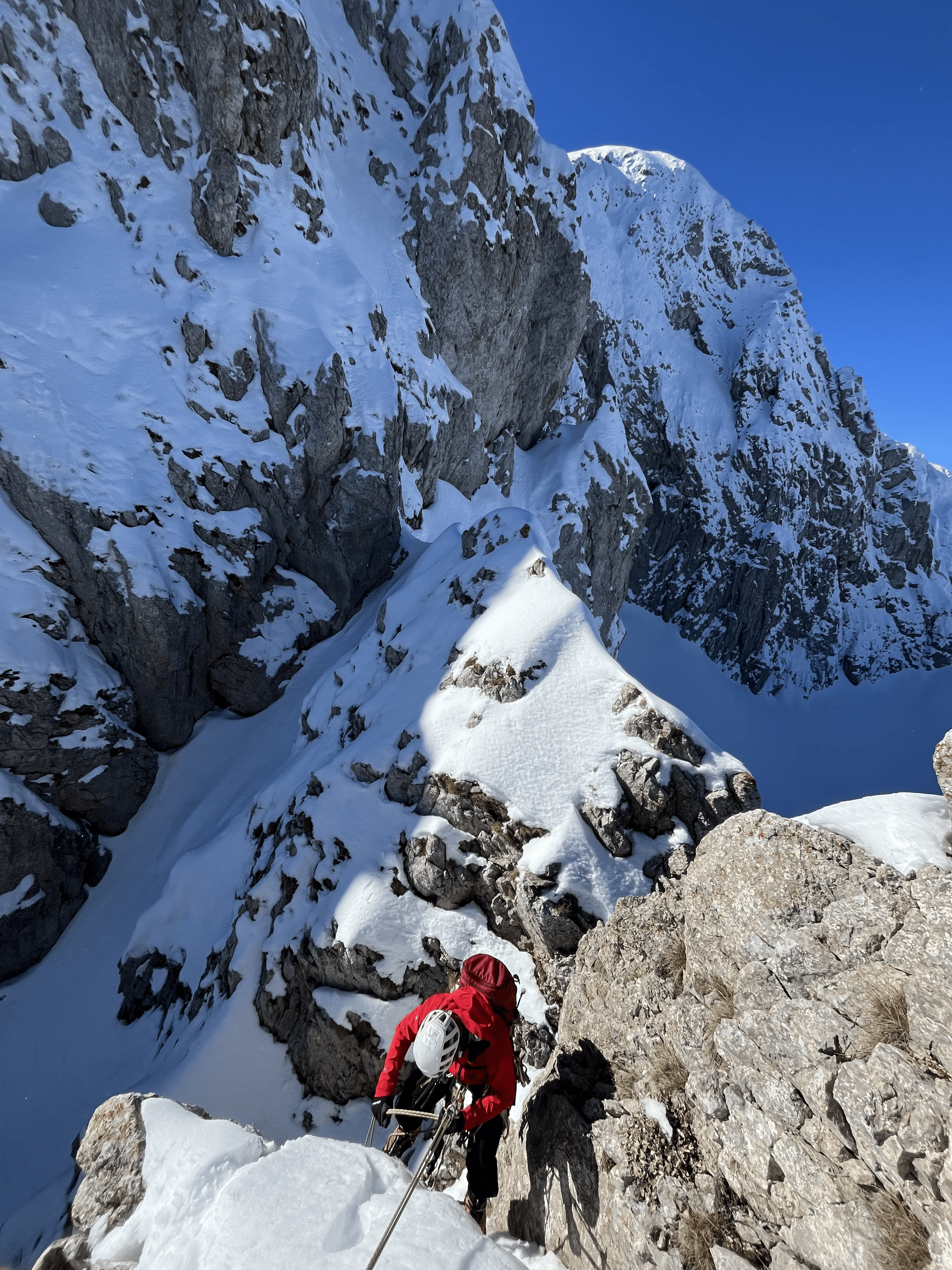 Η χιονοκάλυψη, δεδομένης της εποχής, άκρως ικανοποιητική. Το ηθικό μας στα ύψη! Φαίνεται να έχει συνθήκες, μουρμουράμε. Νομίζαμε... Ξεκινάμε την πρώτη εύκολη σχοινιά και διαπιστώνουμε πως δεν έχουν κάτσει τα χιόνια. Δεν έδεσε το γλυκό. Εξάλλου γι αυτό πήγαμε στην κοψούλα. Κάνει ο Αντώνης το ρελεδάκι και βρίσκει τους παρατημένους ιμάντες του ραπελ. Το πολύ 10 μέτρα ραπελάκι, μια περίεργη τραβέρσα και φτάνεις στο άβολο ρελε πριν την δεύτερη και τελευταία σχοινιά.